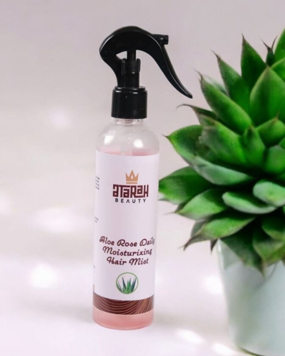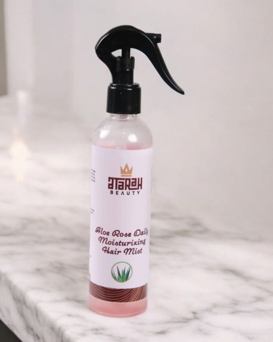 Revitalize your hair with our Aloe Rose Daily Moisturizing Hair Revitalize your hair with our Aloe Rose Daily Moisturizing Hair Mist, a hydrating spray designed to nourish and refresh your strands throughout the day. Infused with the soothing properties of aloe vera and the gentle aroma of rose water, this mist delivers essential moisture, enhances shine, and promotes a healthy scalp environment